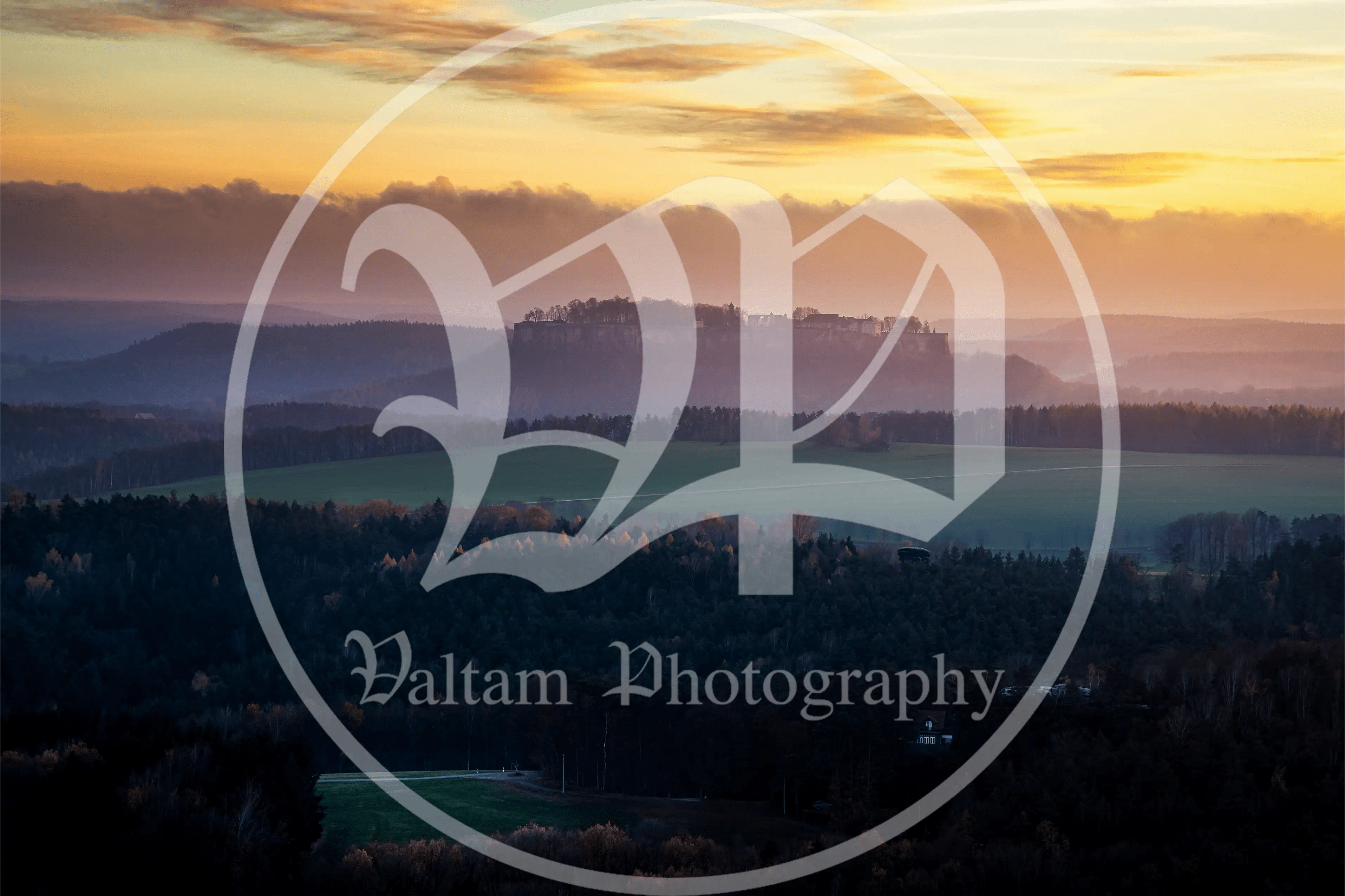 Prachtvolle Farben beim Sonnenaufgang auf Festung Königstein. Die gigantische Festungsanlage im samtigen Farbenkleid. Perfekt als Wanddekoration.