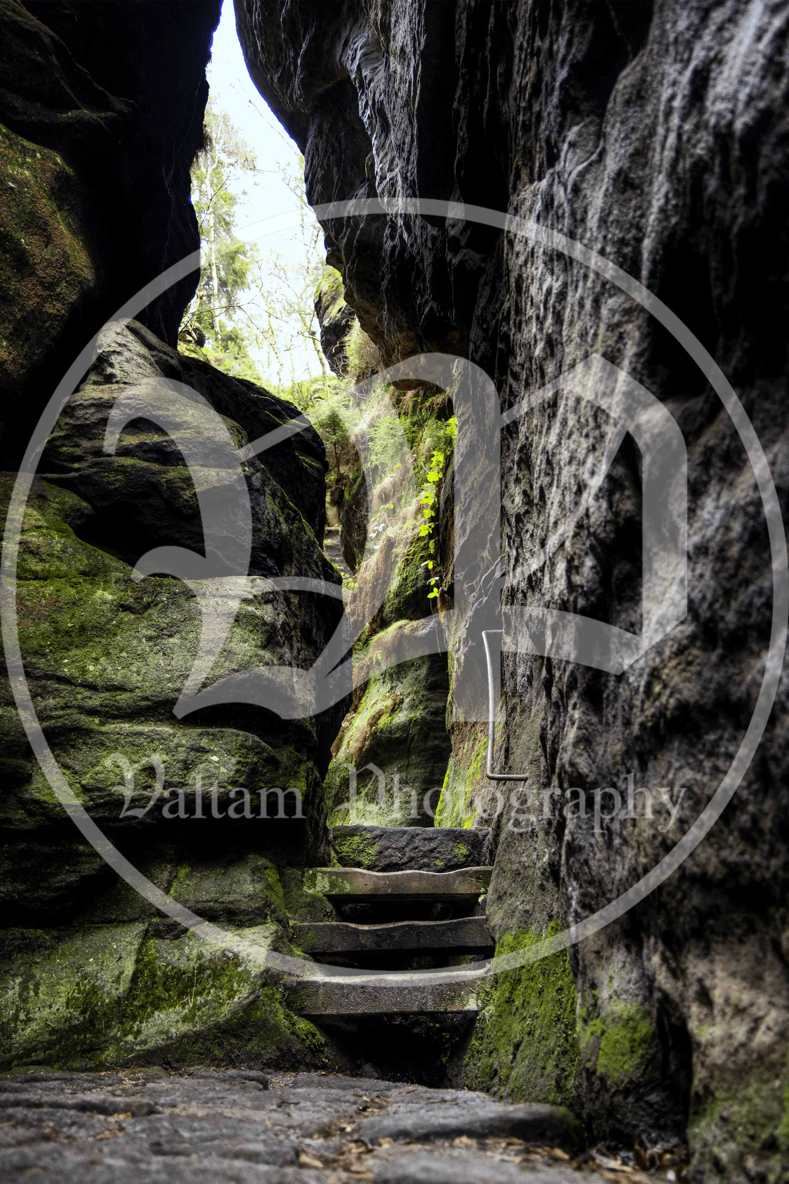 Schroffe Sandsteinwände, Treppen in den Stein geschlagen und enge Durchgänge. Ein typischer Wanderweg in der Sächsischen Schweiz ist ein ganz besonderes Erlebnis. Mit diesem Wandbild holt man sich diese einmalige Natur nach Hause.